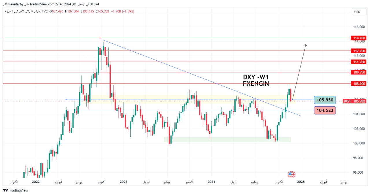 تحليل مؤشر الدولار الأمريكي (DXY) على الفريم الأسبوعي يشير إلى تطورات ملحوظة ومناطق رئيسية للمتابعة. دعونا نلقي نظرة أعمق على ما يعكسه الرسم البياني: