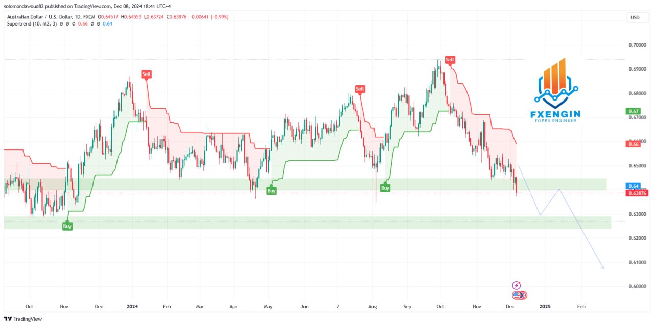 الاتجاه العام لزوج الدولار الأسترالي مقابل الدولار الأمريكي يبقى هابطًا، مدعومًا بكسر مستويات الدعم الرئيسية. يُنصح بالتداول بحذر مع مراعاة إشارات التأكيد واستخدام استراتيجيات وقف الخسارة لحماية رأس المال.