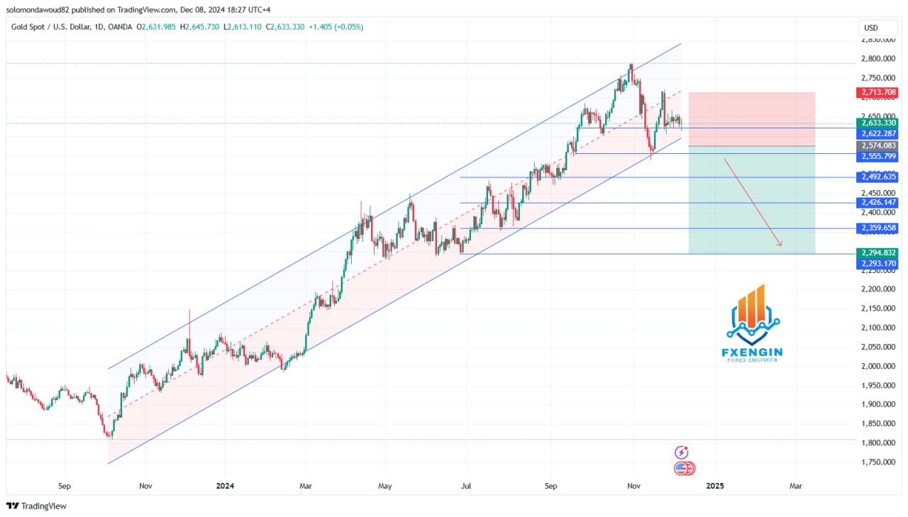 • 2622 – 2574: منطقة دعم محورية داخل القناة، وإذا كسرها السعر قد يتجه نحو: