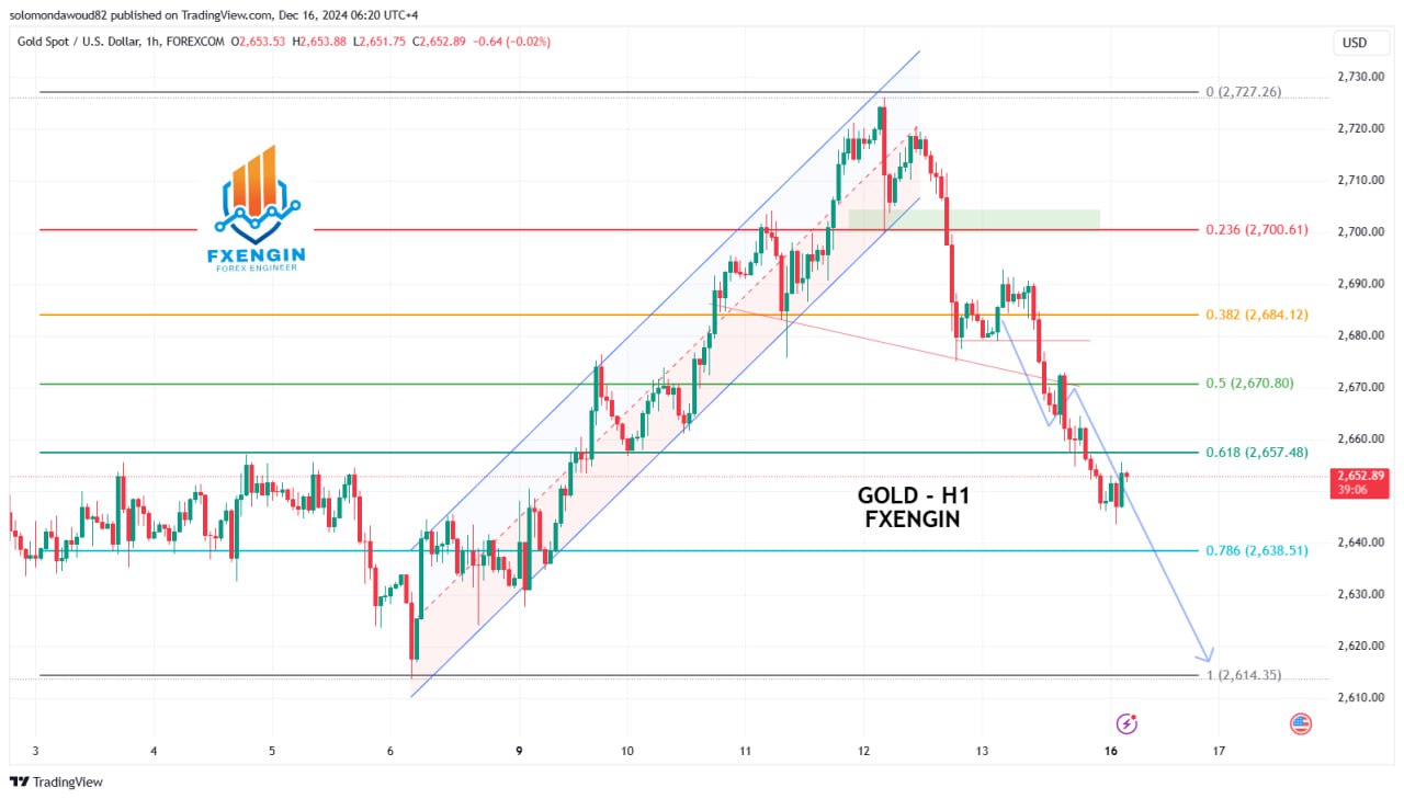 في حال استمر الزخم السلبي والضغط البيعي، قد يستهدف الذهب مستوى الدعم عند 2,614.35 دولار.