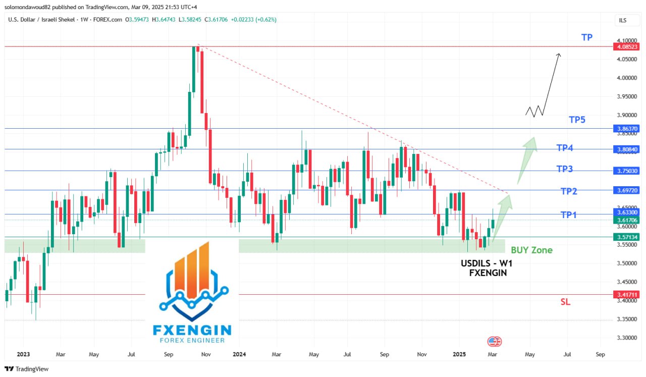 تحليل زوج الدولار الأمريكي / الشيكل الإسرائيلي (USD/ILS) – الإطار الأسبوعي (W1)