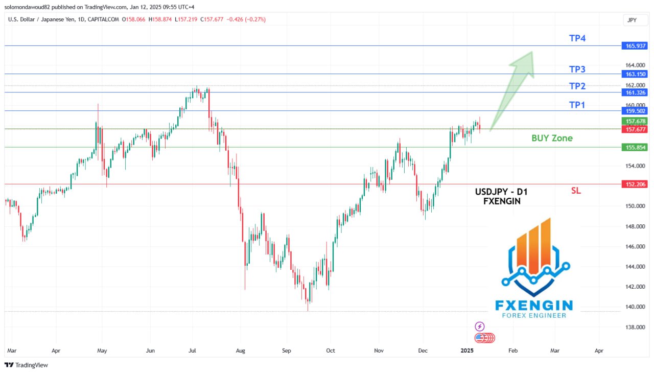 تحليل زوج الدولار الأمريكي مقابل الين الياباني (USD/JPY) – الإطار الزمني اليومي (D1):