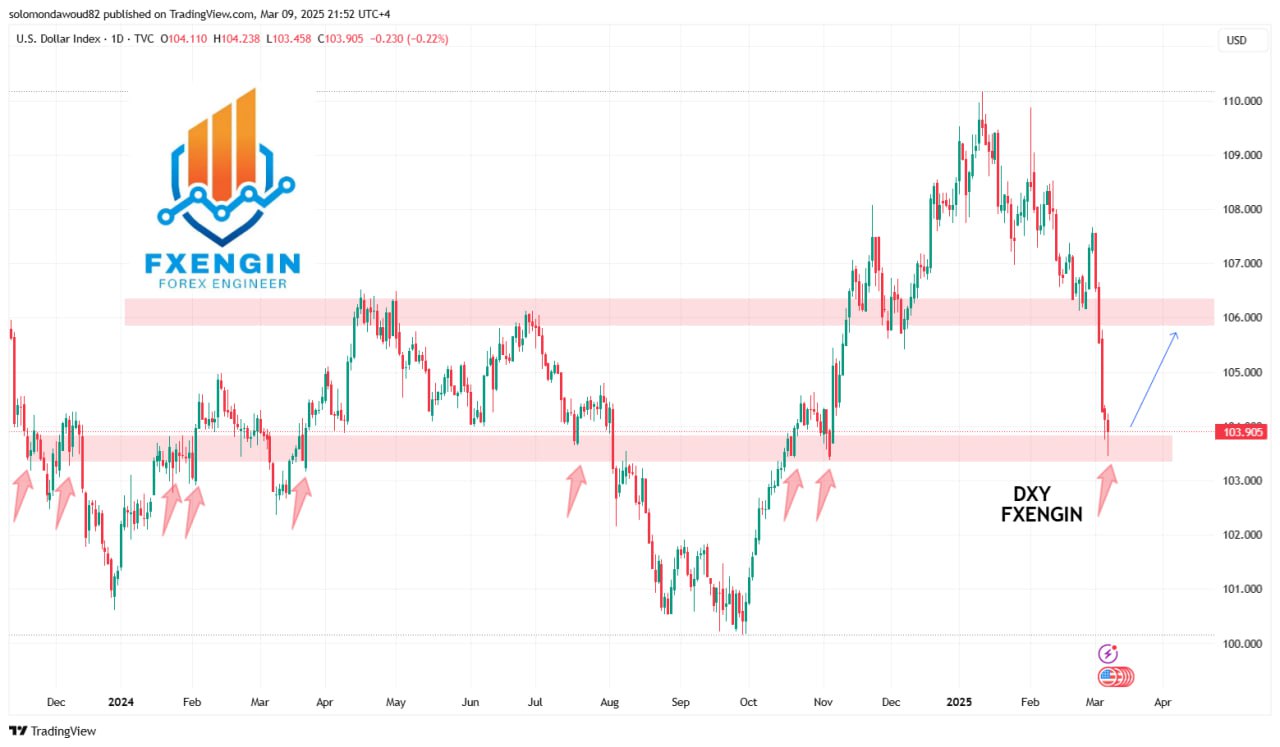 السعر حاليًا عند منطقة دعم رئيسية بين 103.50 – 104.00، والتي ارتد منها عدة مرات سابقًا كما هو موضح بالأسهم الحمراء.